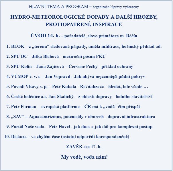 Spolu s SPÚ Děčín podporuje Magistrát m. Děčín tyto osvětové konference Spolku Aquarius-Vodnář, SAV v tématu, které je stále aktuálnější pro místní i krajské úrovně, svazy výrobců, producentů, dopravců a další, rovněž pro plány rozvojů a strategie nejvyšší.