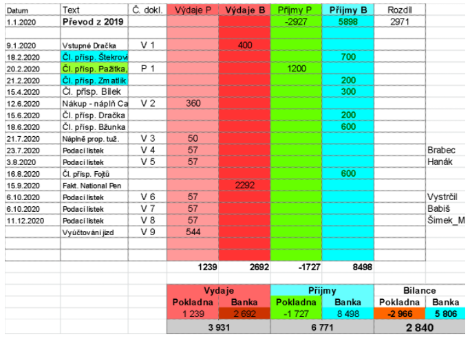po převodu plusového zůstatku z r. 2020 byly příjmy dále tvořeny členskými příspěvky ve výši 2 600Kč.
